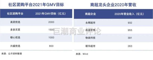 据悉,美团优选将2021年的GMV锁定在2000亿元,多多买菜、橙心优选、兴盛优选的2021年GMV目标分别为1500、1000、800亿元;作为对比,国内商超界的龙头永辉超市和高鑫零售2020年的营收分别为932和955亿元。