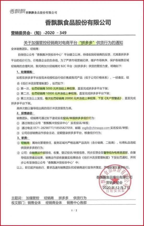 去年12月,可口可乐、卫龙、金龙鱼、香飘飘、紫林等品牌曾纷纷发出《关于禁止给电商平台社区团购供货的通知》,维护其市场价格秩序。