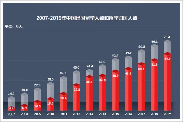 单看这幅图,情况好像还不错,虽然每年出国人数(灰柱)很多,但回国人数(红柱)也不少,最近几年回国率更是接近八成。