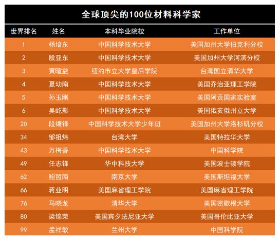 而根据路透社母公司——汤森路透的统计,全球十大材料科学家,前6名都是华人,其中5人毕业于中科大。