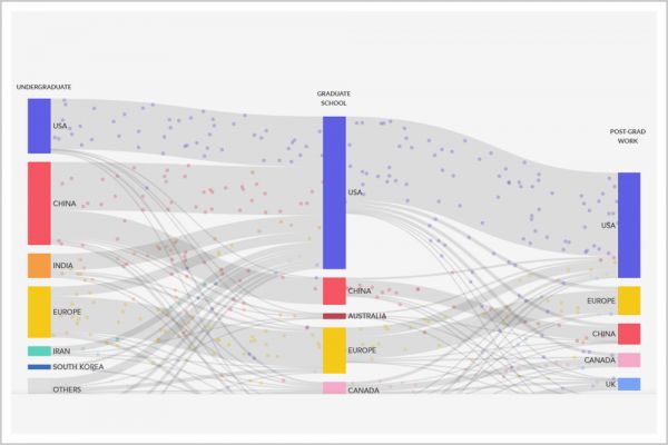 仔细一算,每年留在海外的人数其实一直很稳定,基本上保持在十几万人的水平。下面这幅图生动展示了中国人才流失的情况。