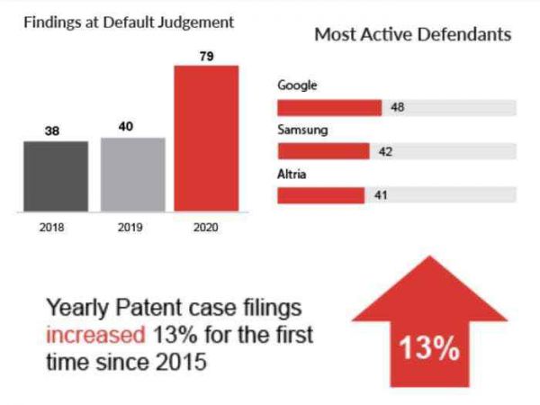 根据2020年提交的案件,谷歌、三星、微软以及戴尔等跻身为最活跃的十大被告之列