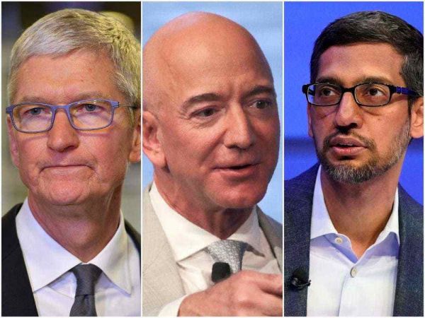 从左至右分别为苹果首席执行官蒂姆·库克、亚马逊创始人杰夫·贝索斯以及谷歌首席执行官桑达尔·皮查伊