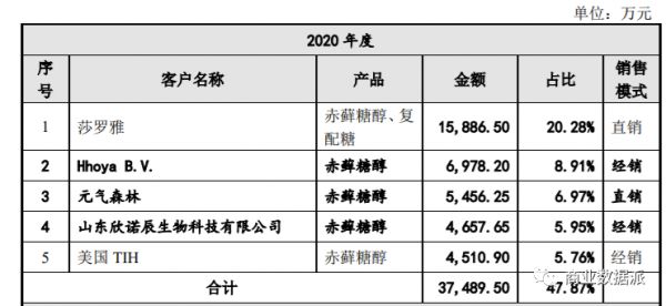 这也与三元生物的招股书数据相吻合。实际上,目前三元生物主要产品依然以外销为主,且三元生物前五大客户集中度偏高。2020年,除元气森林外,三元生物前五大客户全部为美国公司,占总营收40.9%。2018年至2020年,三元生物外销收入分别为2.1亿、4.0亿和 5.6亿,占当期主营业务收入的比例分别为82.25%、89.53%和71.86%。