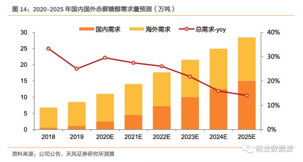 在消费升级、无糖低糖的大趋势下,赤藓糖醇的需求量势必将继续扩大。根据天风证券研报,由于无糖、低糖大势所趋,赤藓糖醇需求量有望持续增长。预计未来国内需求复合增速超过40%,到2025年全球赤藓糖醇需求量有望达到28.5万吨。根据沙利文研究院预测,2020年至2024年,全球赤藓糖醇需求量将以22.1%的年均复合增长率进一步增长。