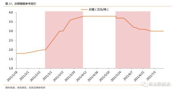 值得一提的是,由于前期赤藓糖醇使用范围较窄,客户应用较少,消费者认知度不够,市场导入期相对较长,赛道玩家也较少。随着赛道玩家的加入,行业整体产能释放后供需终将走向平衡,赤藓糖醇也将从当前高位走向更为合理的价格区间。