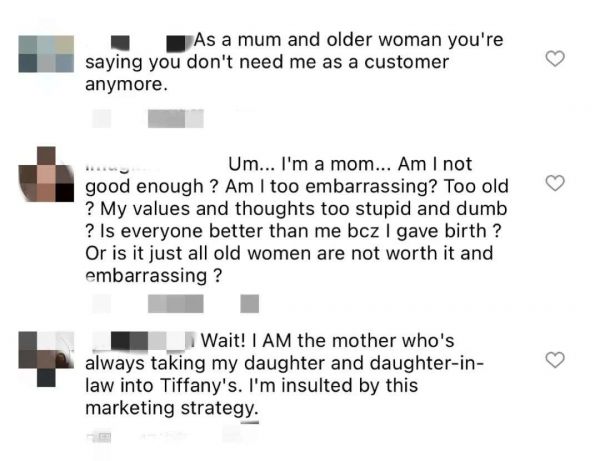 在官方发布的帖子评论中出现了许多反面声音:“作为一个妈妈,你是说你不再需要我这个顾客了”、“是不是所有年长妇女都不值得拥有?”、“我会给我的女儿购买Tiffany,但是这个宣传对我造成了侮辱”……