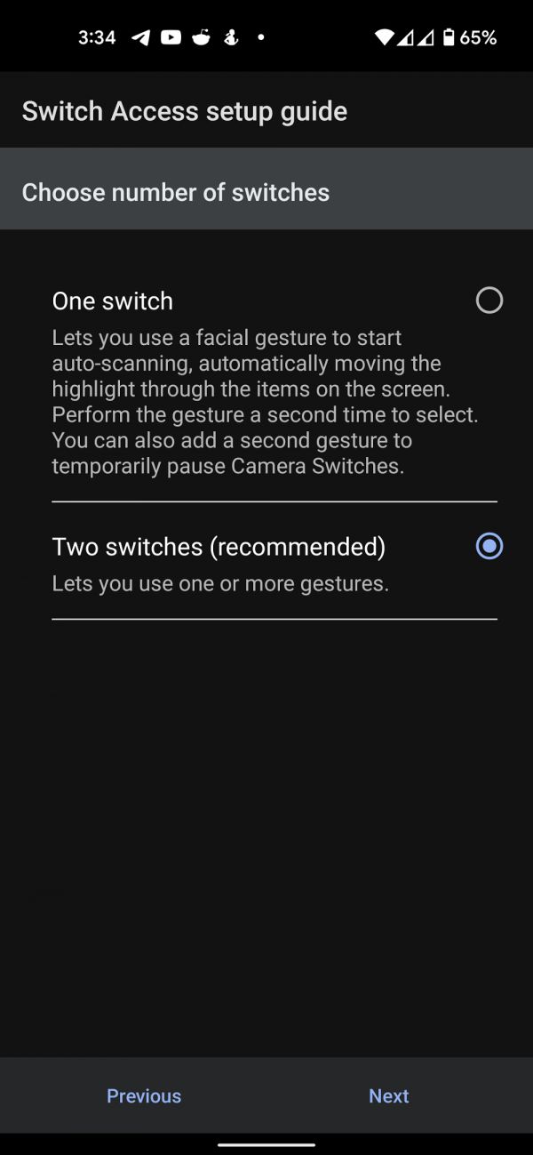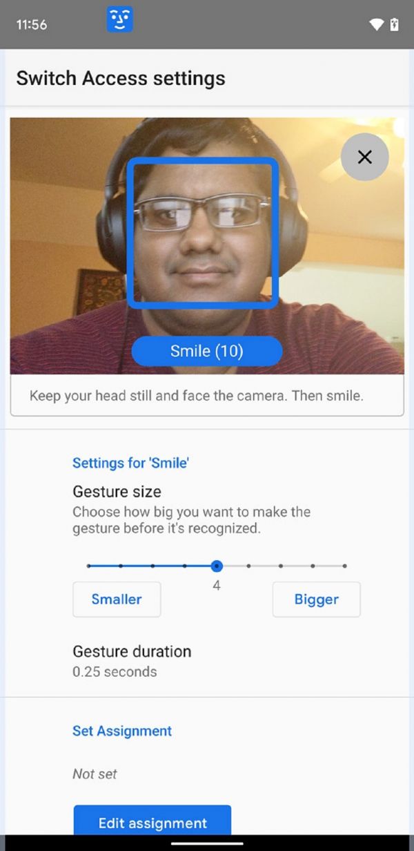 开关访问功能用于设置用户操控手机的快捷方式,比如通过蓝牙、USB连接,用户可以设置无线耳机、外接键盘等设备如何操控手机,现在谷歌又增加一种“非接触式”操控方式——用脸。