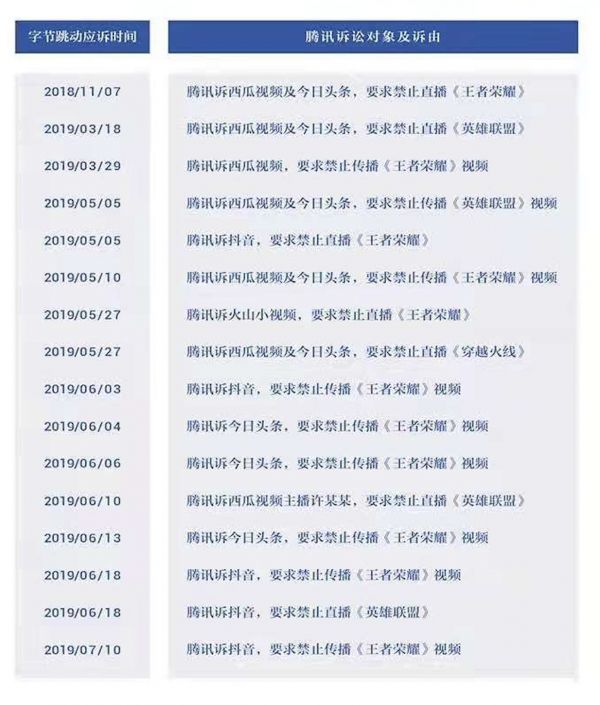 根据字节跳动公开的信息,2019 年 2 月 18 日,腾讯在广州知识产权法院申请到诉讼禁令,要求西瓜视频停止用户直播《王者荣耀》游戏内容。这是近年中国游戏直播行业的第一个行为保全禁令。