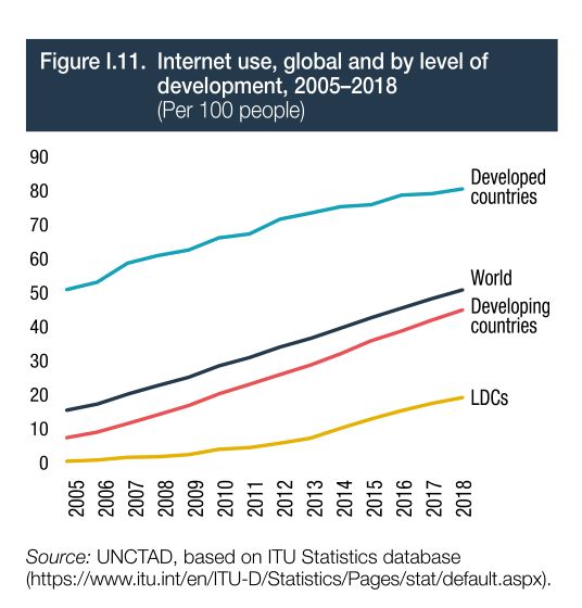联合国贸发会发布的《2019年数字经济报告》指出,2005年至2018年,发达国家与发展中国家均在互联网使用率上提升约30%;而在这十几年间,最不发达国家(Least Developed Countries, 简称LDCs)的网络使用仅呈现不到15%的增长。
