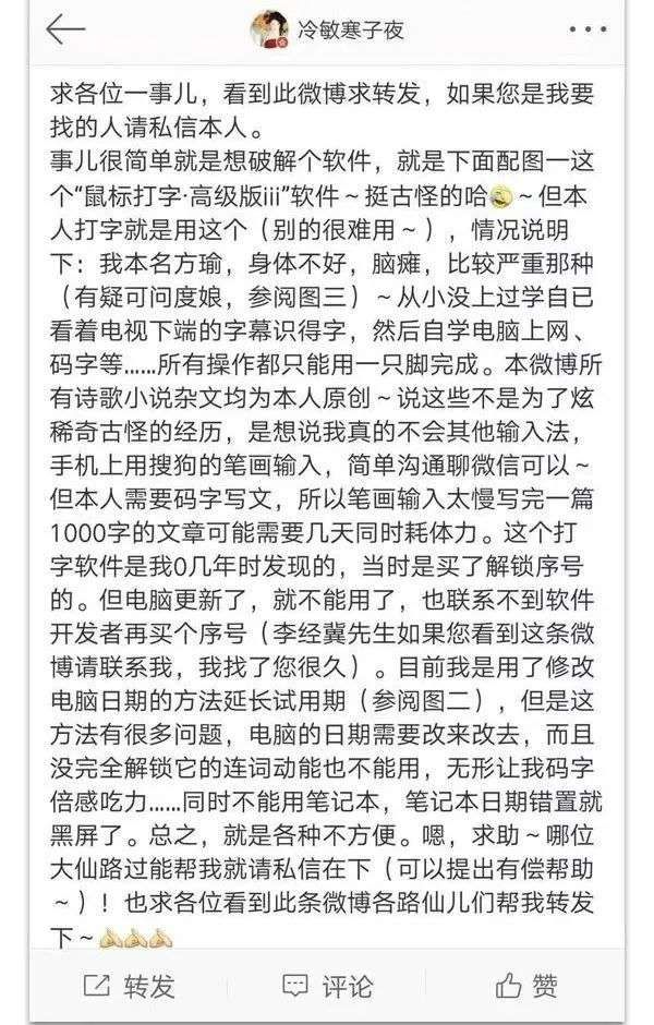 同年,一则求助消息在社交媒体引起人们的关注,这是一名叫方瑜的女孩求人破解一款叫做“鼠标打字·高级版ⅲ”的软件。原来,早在2008年,方瑜就接触到了这款软件,也正是这款软件帮助让她开始了互联网创作。尽管软件为方瑜带来了巨大的帮助与慰藉,但遗憾的是,方瑜口中“为自己量身定做”的软件直到开发者离世时也没能卖出太多套。