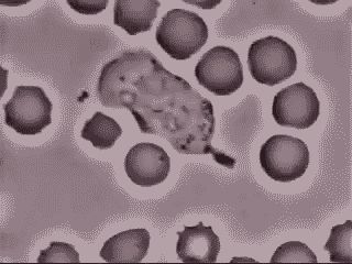 而下面这个正在追杀黑点(细菌)的灵活胖子,叫巨噬细胞,一种非常重要的免疫细胞。它拥有巨大的细胞体和无以伦比的灵活移动能力。它能感知细菌等病原体发出的信号,从而实现精确打击,为身体保驾护航。一眼就能认出来。