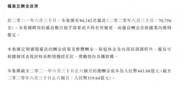 据腾讯财报显示,2021年6月30日,集团有94,182名雇员(2020年6月30日:70,756名)。集团截至2021年6月30日止六个月的总酬金成本为人民币443.88亿元(截至2020年6月30日止六个月:人民币319.64亿元)。