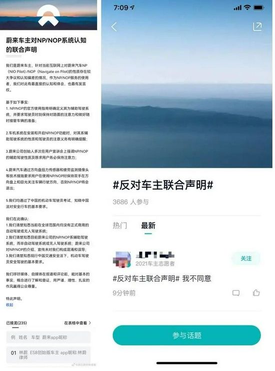 针对这份声明,有蔚来车主在蔚来APP上发起了#反对车主联合声明# 的话题,并已获得超过三千位用户参与支持。