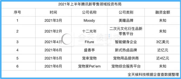 根据企查查的数据,截至2021年7月22日的上半年,腾讯在新消费领域的投资事件共6起;特别是在二季度,新消费更受腾讯偏爱,包括宠物、轻餐、二次元衍生品零售等细分赛道均获得其青睐。