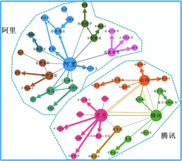 区别在于,阿里的投资仍然是以阿里巴巴为核心,向外层层拓展;腾讯更像是在画同心圆,形成了腾讯、京东、永辉多中心格局,以局部“团战”方式迎敌,即以资本关系为纽带,串联起产业链上下游企业,各方通力合作、共同发展。