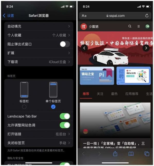 如果你将标签页设置为「单个标签页」,也就是把导航栏放回顶部,那么可以发现打开书签栏后几乎会占据整个屏幕,这与之前无异。可是,当我把标签页设置为「标签栏」,也就是把导航栏放到底部,那么打开书签栏后可以看到一个全新的设计,新的书签栏只占据了半个屏幕,当前浏览的网页有一半不会被遮挡。