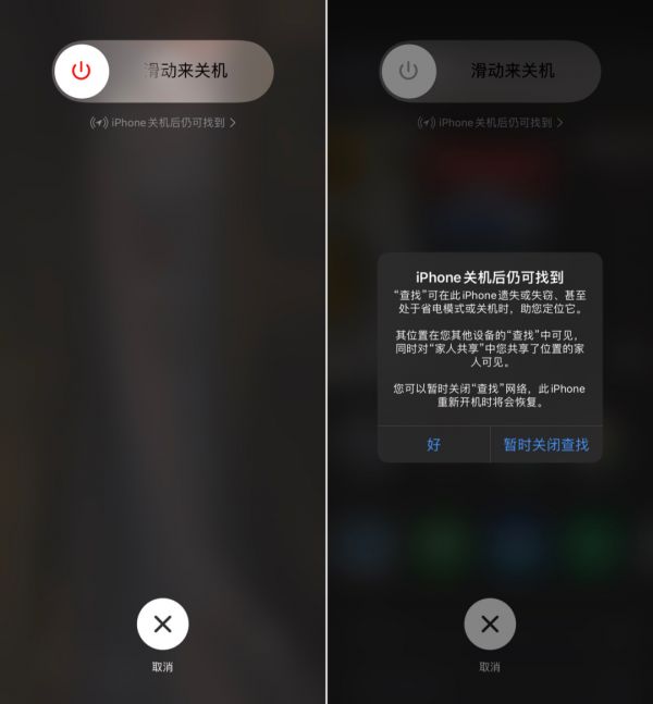 如果你的手机已经更新到了 Beta 5,那么你在将 iPhone 关机前看到一条新增的文字提醒,告知你即使在关机状态下也可以通过查找功能来定位手机。当然,如果你不想在手机关机的时候继续定位,可以点击这条提醒按照提示暂时关闭这项功能。