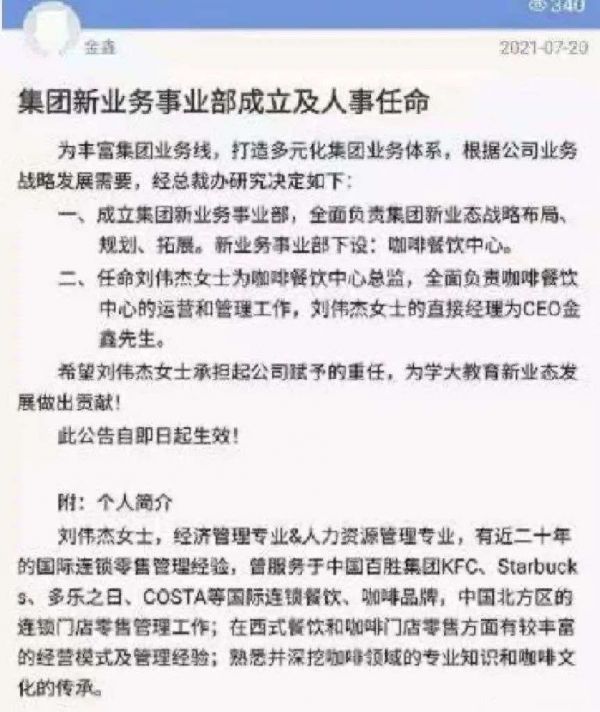 6月25日,教培机构学大教育公开信息显示,其在近期新增投资且100%控股了一家咖啡公司——北京琢器咖啡有限公司。5天以后,一份来自学大教育内部任命邮件流出,学大教育宣布将成立集团新业务事业部,明确表示新业务事业部下设咖啡餐饮中心,任命刘伟杰为咖啡餐饮中心总监,其直接经理为学大教育CEO金鑫。
