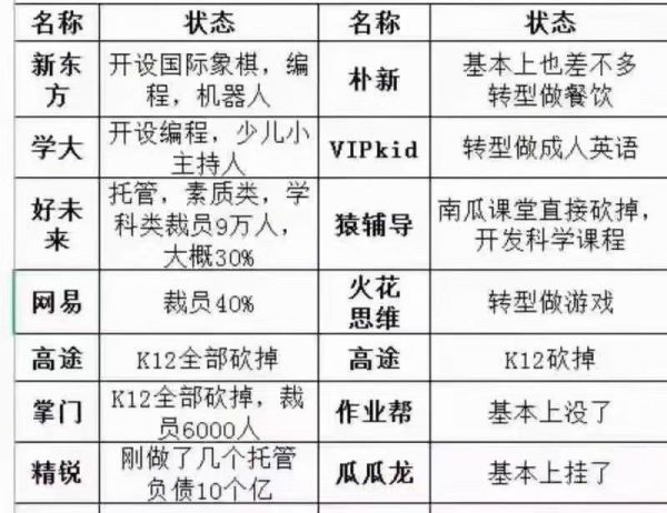 除学大教育,网上还流传了一份其他在线教育公司的转型名单,显示美股上市公司朴新教育也在积极探索转型餐饮,寻求新的增长线。显然,餐饮成为了教育企业“自救”的新选择。