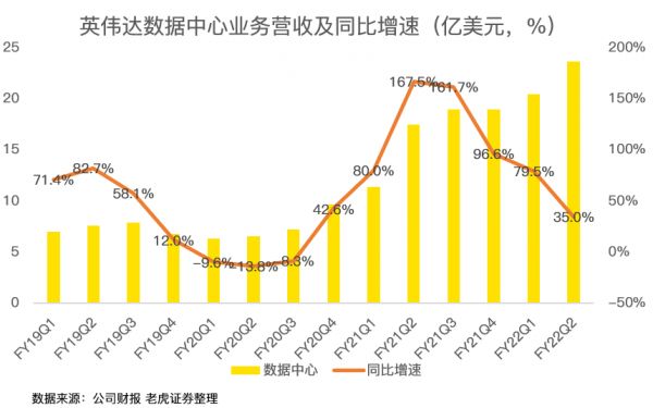 因此,市场最为关心的业务集中在数据中心上,毕竟此业务有望成为未来英伟达最主要的收入来源,且下游对数据中心产品的需求,相对游戏显卡更为稳定。二季度,数据中心业务营收23.66亿美元,同比增长35%,略超市场预期。从季度营收增速趋势上看,数据中心在疫情红利和收购Mellanox逐渐消退之下,部门增速开始回归正常。