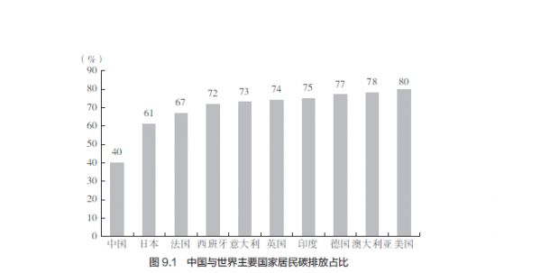 居民是工业生产的终端用户。居民生活碳排放包含两方面,一方面是生活中的能源消耗造成的直接碳排放,另一方面是生活中进行的消费、购买的服务等造成的间接碳排放。依据碳足迹的概念,这一部分碳排放也包含消费品生产过程中所产生的碳排放。据此测算,我国居民生活碳排放量约占总排放量的40%,相对应的发达国家居民生活碳排放占比为60%~80%(见图9.1)。这表明随着生活水平的日益提升,居民生活碳排放占比还有提升的可能性,因此,倡导绿色生活方式需要未雨绸缪。