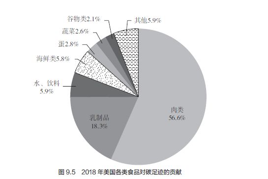 素食产生的碳排放量在同等情况下远远小于肉食。主要原因是动物在成长过程中对食物的利用率较低,以及会排放甲烷类气体。即使在肉类食品中,不同类型的肉所产生的碳排放量也不同,比如牛肉和羊肉等红肉所产生的碳排放量是相同质量的鸡肉、猪肉类食品的约4倍(见图9.4)。根据不同的饮食习惯,美国等西方国家中,一份均衡的饮食结构中肉类占饮食碳排放量的56.6%(见图9.5),是饮食碳排放中最主要的组成部分。而中国人摄入水稻类主食较多,肉类占饮食碳排放量的36.5%(见图9.6)。