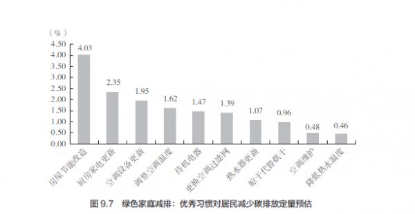小习惯减少碳排放。尽管家庭生活部分的碳足迹占居民碳足迹排放比例超过了20%,但家庭生活减排却没有“一招鲜”的解决方案。减少家庭生活的碳排放,要依靠科技、能源的进步,更重要的是通过平日一些小的绿色生活习惯,日积月累地减少碳排放。根据密歇根州立大学研究学者的测算,推行各种不同减少碳排放的绿色生活方式,总计可以减少家庭生活碳排放量超过15% (见图9.7)。这些好的方法和习惯,包括房屋节能改造、家电更新维护、晾干代替烘干、降低热水温度等。