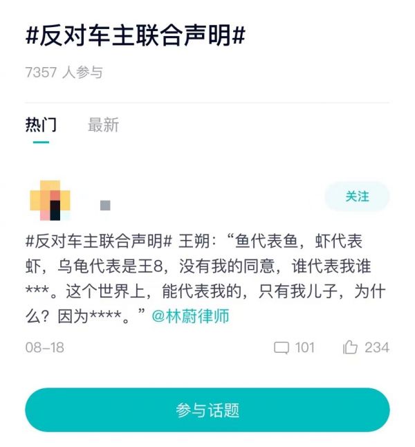 蔚来的车主们一下子划分成两个阵营,维护蔚来的车主被网友调侃为“蔚忠贤”。截至发稿,蔚来社区上#反对车主联合声明#的话题已有7357人参加。