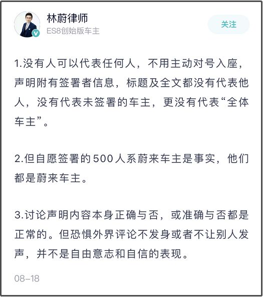 8月18日,蔚来官方对林蔚发布的蔚来车主的联合声明作出回应,称此声明并非蔚来官方发布,系由蔚来车主自发组织发起的联合声明,与蔚来官方没有关联。