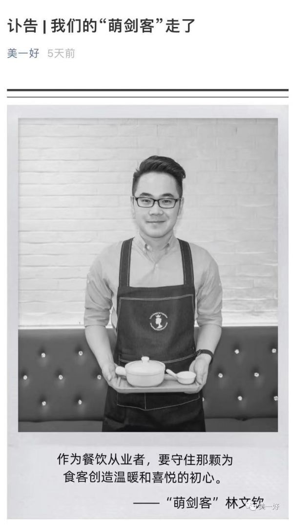 8月14日,“美一好”公众号发布一则落款为林文钦治丧小组的讣告,讣告宣布上善若水投资管理公司创始人、意统天下餐饮管理公司创始人、美一好品牌管理公司创始人“萌剑客”林文钦去世的消息。
