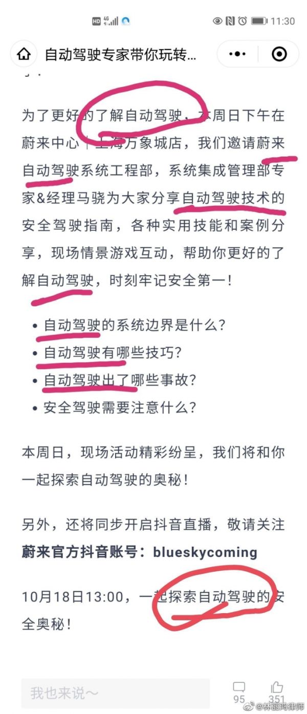除了蔚来车主们之间的隔空喊话外,众多车主和网友也开始探讨“自动驾驶”这一概念,不少业界大佬也加入了关于“自动驾驶”的讨论,纷纷建议修改自动驾驶命名方式,以免误导用户。而此前,蔚来曾在多个场合宣传“自动驾驶”。