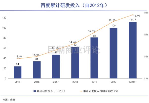 截至2021年6月末,百度累计投入研发费用1117亿元,占过往9.5年累计营收的15.9%、累计经营利润的97.2%!