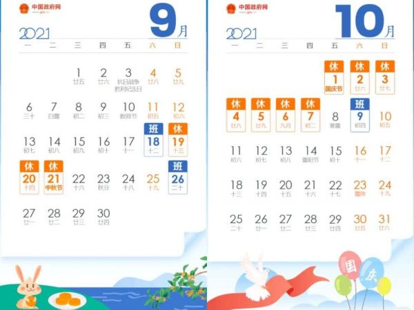 8月19日,据中国政府网消息,中秋、国庆假期放假安排已出炉。中秋节:9月19日至21日放假调休,共3天,9月18日(星期六)上班。国庆节:10月1日至7日放假调休,共7天,9月26日(星期日),10月9日(星期六)上班。