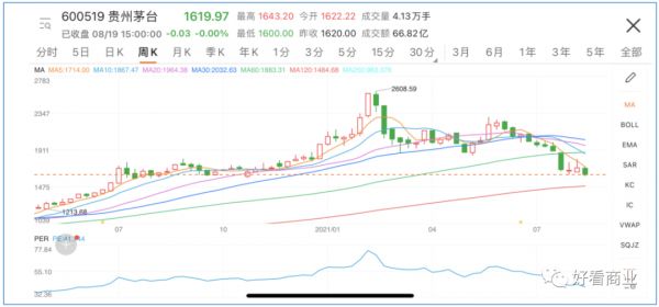 再看贵州茅台。2020年,贵州茅台是A股市值增长冠军,一年涨幅85%。截至8月18日,茅台在盘中跌至1600元,较2月创下的历史高位2608.59元已下跌约38%。