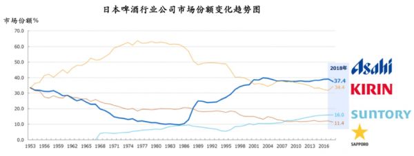 但相比饮料,日本的啤酒行业是一个相当集中的市场。战后,占据市场份额70%以上的【日本麦酒】解体,分拆成【朝日啤酒】和【SAPPORO啤酒】两家公司。