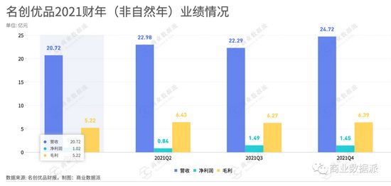 2021财年第四财季,名创优品逐步走出疫情阴霾,但依然在陷入国内市场的内卷中,寻求出海增长点。财报显示,该季度名创优品总营收达24.72亿元(人民币,下同),较去年同期大幅增长59%;毛利增加至6.39亿元,同比增长68.4%;利润方面,名创优品本季度的净利润(Non-IFRS)为1.45亿元,同比大幅增长242%,较上一季度净利润略有下降。