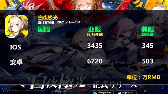 一度被玩家“开除二次元籍”的“大恶人”腾讯,这两年也是在精品二次元游戏上持续发力,一连推出了《白夜极光》《宝可梦大集结》两款爆款游戏。其中《白夜极光》2021年6月中旬在日韩地区上线首日便拿下了两地免费榜榜首,上线半月收入超一亿元。截至7月,《白夜极光》日韩服仍稳定在畅销榜前30,7月海外地区的流水也在逼近被认为是竞品的《明日方舟》——这还是在《明日方舟》该月有限时活动以及新卡池、而《白夜极光》还没有开启第一个活动期的情况下。