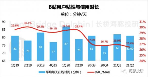 着眼用户表现,二季度,B 站用户日均使用时长达 81 分钟,虽然高于往年同期,但由于Q2淡季,环比减少了 1 分钟。用户粘性(DAU/MAU)为 26.4%,创两年新低。