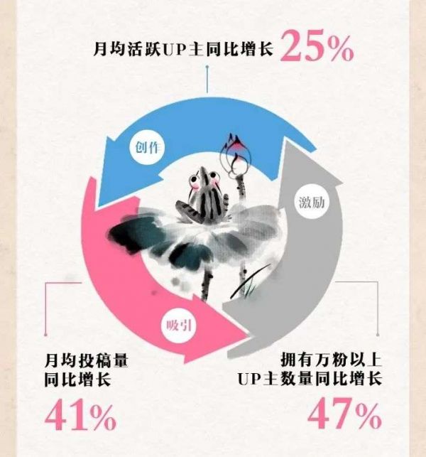 随着B站不断完善流量分配机制、扶持中小UP主成长,B站万粉以上的UP主数量,同比增长了47%。本季度B站月均活跃UP主数量达240万,同比增长25%;月均视频投稿量达840万,同比增长41%。