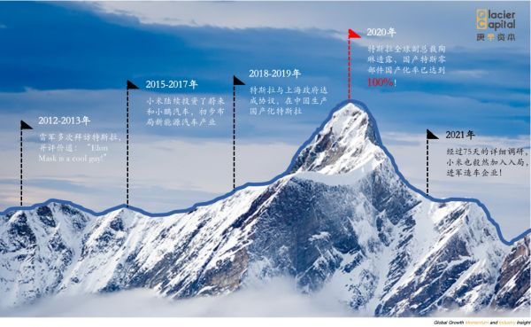 从2003年特斯拉汽车成立,到2012、2013年雷军多次拜访特斯拉和马斯克,随后投出蔚来、小鹏两大新能源汽车巨头,到近年来随着特斯拉国产化率的逐渐提高,多次传出小米造车并被多次辟谣,再到2020年底特斯拉宣布100%国产化率后一个季度的2021年3月,雷军正式宣布造车,整整过了18年。