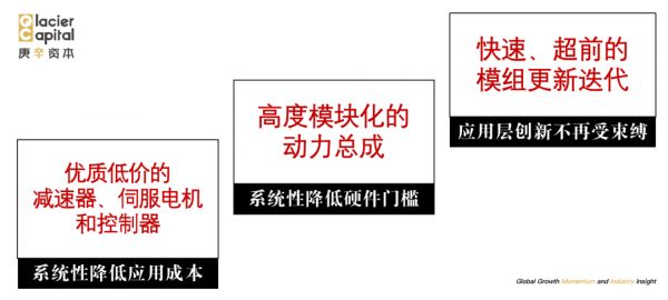 此时若有若干家零部件厂商,以优质低价零部件产品,实现现有产品结构和形态的迭代,降低整个行业的硬件门槛和价格,将机器人的价格降低到今天的1/3-1/5,并且收敛机器人行业的供应链,不再需要再从多家供应商采购产品后组装,那么应用层将有望突破现有的硬件限制,专注于发挥自己的想象力、快速实现产品的研发,从而突破奇点,迎来爆发。