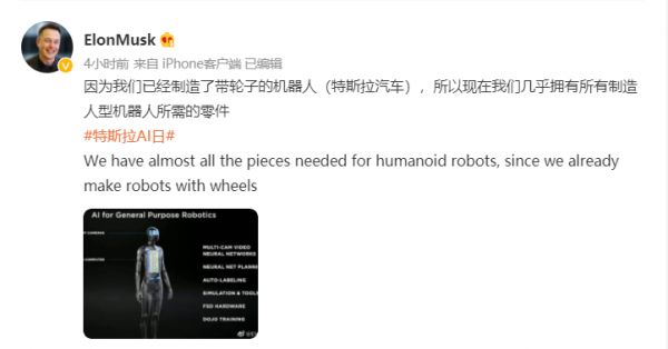 人工智能已成为特斯拉的标签。马斯克在微博上发文称,“我们已经制造了带轮子的机器人(特斯拉汽车),所以现在我们几乎拥有所有制造人形机器人所需的零件。”