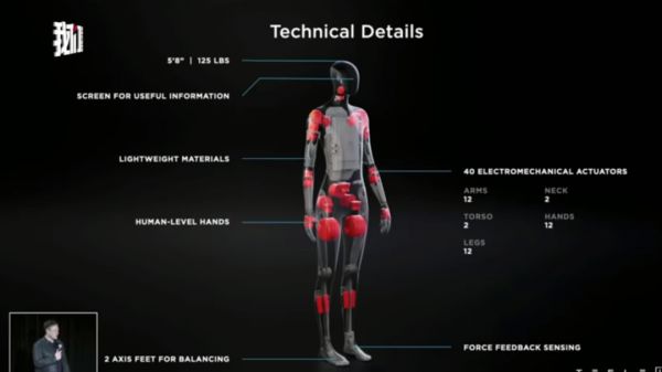 Tesla Bot的外形与正常的人类相似,其面部配备一个屏幕用以显示相关信息,四肢则是通过40个机电执行器进行操作,并通过力反馈感应系统来实现平稳和敏捷双脚行走,最快行走速度可能为5英里/小时(约合8公里/小时),5根灵活可弯折的手指,也为它今后的“工作”提高了精准度。