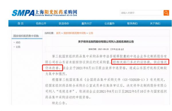 8月20日,上海阳光医药采购网发布《关于将华北制药股份有限公司列入违规名单的公告》,称第三批国家组织药品集中采购品种布洛芬缓释胶囊的中选企业——华北制药(600812.SH)在山东省未能按协议供应约定采购量,经多次约谈协商仍未改善,决定将其列入“违规名单”,并取消其在2022年5月10日前申报国家集采的资格。