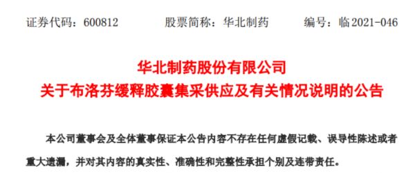 8月22日晚间华北制药紧急发布公告回应表示,公司布洛芬缓释胶囊中选后,虽然公司积极采取了相关措施,但由于现有产能不足,责任单位重视程度不够,相关注册和变更政策调整,加之疫情影响,导致公司无法保障正常供应。公司为了尽量降低对山东省集采供应的影响,2021年8月,经与山东省医疗保障局沟通,由公司提出放弃中选资格,山东省邀请其他企业对该产品补标。