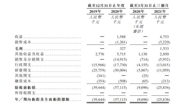 不过,高昂的新产品研发费用和已上市产品的销售费用,使得北芯生命和大多数医疗科技公司一样,仍处于亏损状态。招股书显示,在过去的2019年、2020年两个财政年度和2021年第一季度,北芯生命科技的营业收入分别为0、158.8万和475.3万元人民币,相应的净亏损分别为3,964.4万、5,711.5万和2,583.6万元人民币。