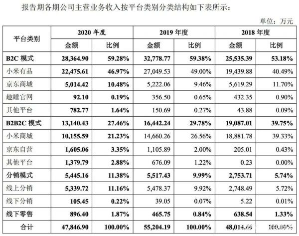 根据招股书,从2018到2020年,趣睡科技分别实现营收4.80、5.52、4.79亿元;归属净利润分别为4387、7393.98、6787.95万元。其中,来自小米系列平台(小米优品、小米商城)的营收,分别占据79.81%、75.56%、68.20%。