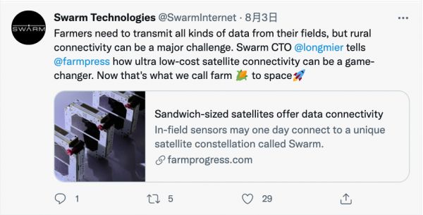 最近,马斯克的太空探索技术公司SpaceX正在进行对Swarm的收购,后者是一家通过微型卫星提供物联网设备和连接方案的公司。