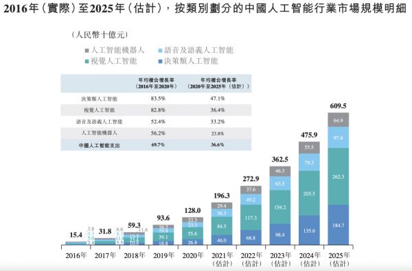 尽管决策类AI目前的市场规模还次于视觉AI,但增速最快。招股书数据显示,2020年中国决策类AI市场的支出规模为268亿元,预计将以47.1%的复合年增长率在2025年增至1847亿元;其中,以平台为中心的决策类AI市场规模2020年为50亿元,预计将以60.4%的复合年增长率在2025年达到535亿元。